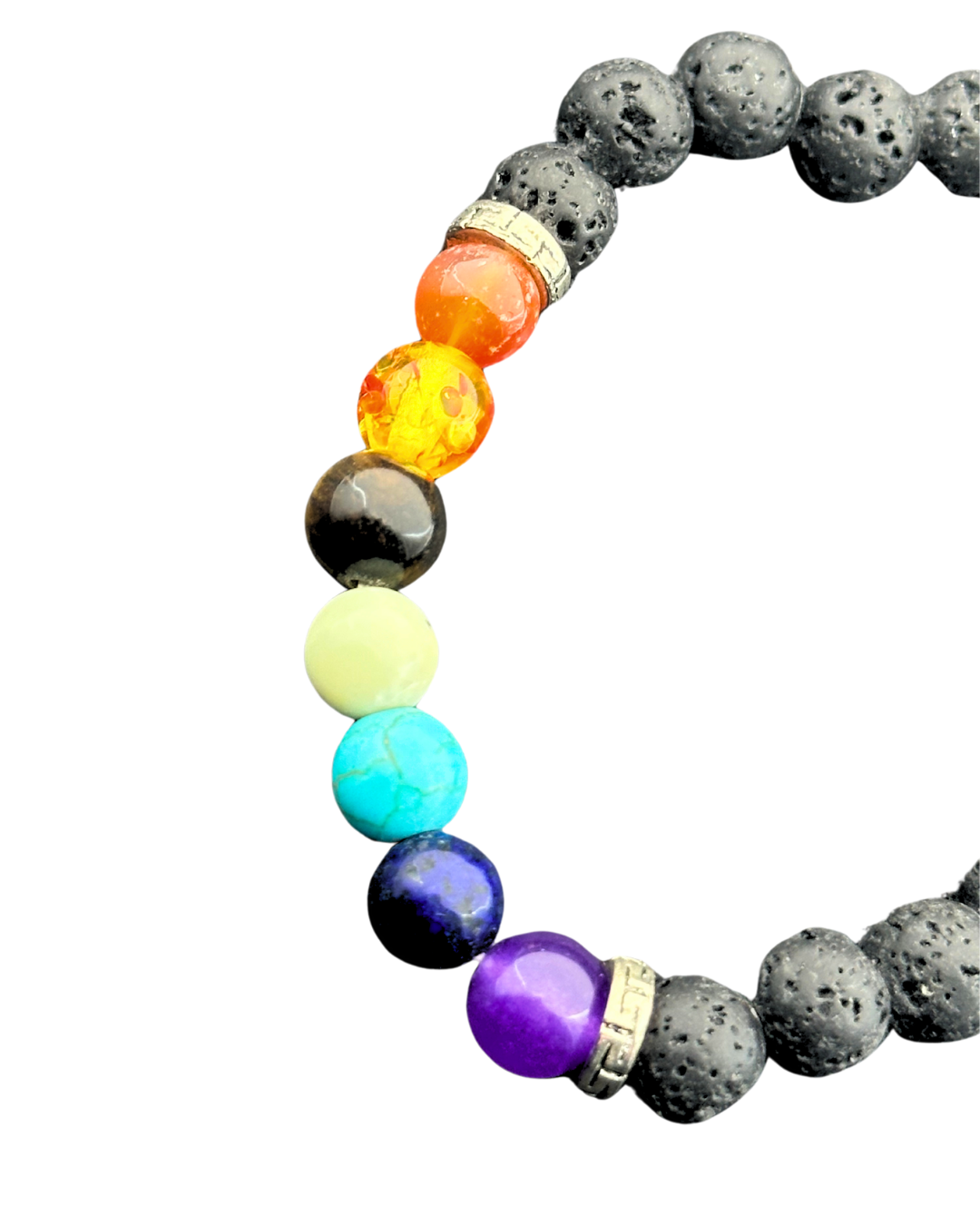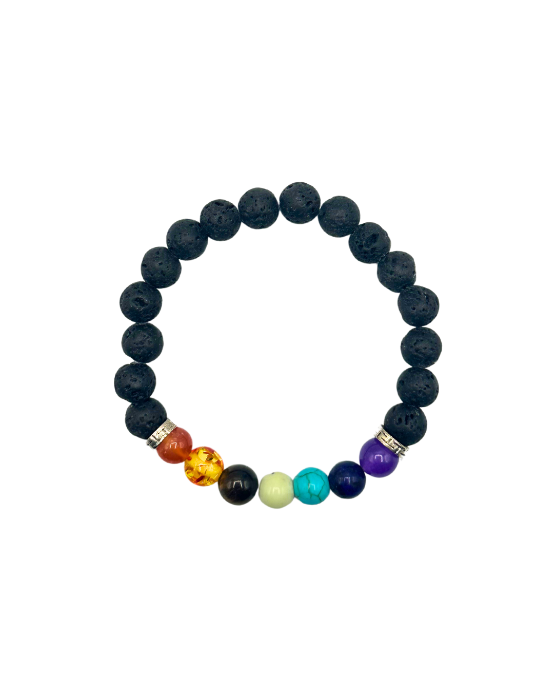 Our 7 Chakras Bracelet are designed to align and balance your body's energy centers. Each bracelet features seven beads, each representing one of the seven chakras, serving as potent conduits for healing, rejuvenation, and spiritual enlightenment. This bracelet features red jasper, amber, serpentine, tiger's eye, turquoise, lapis lazuli, and amethyst, with black lava stone.