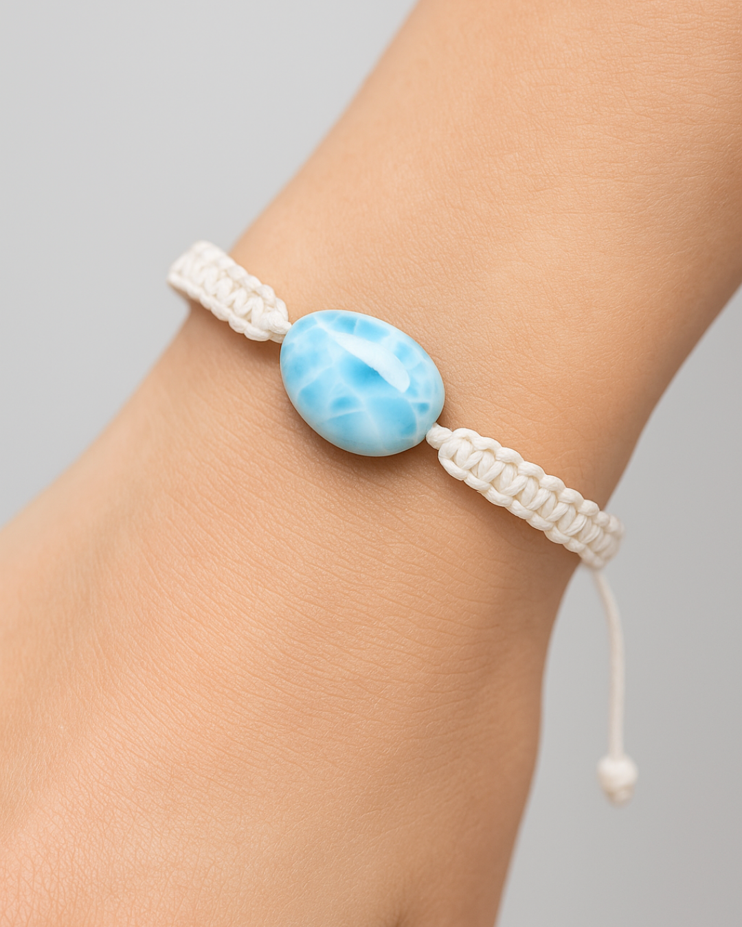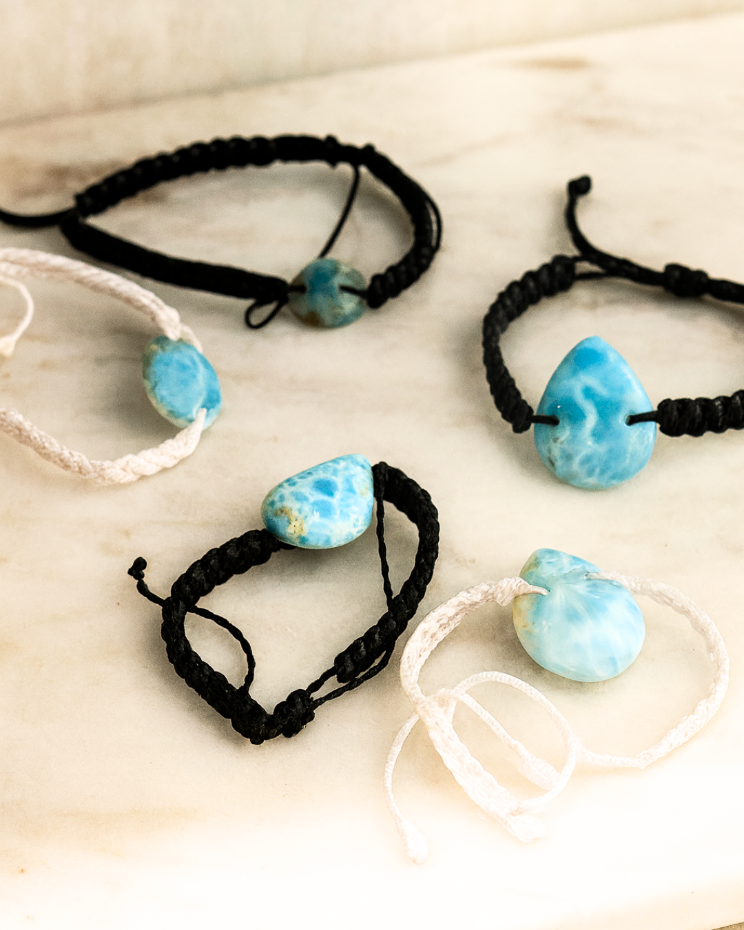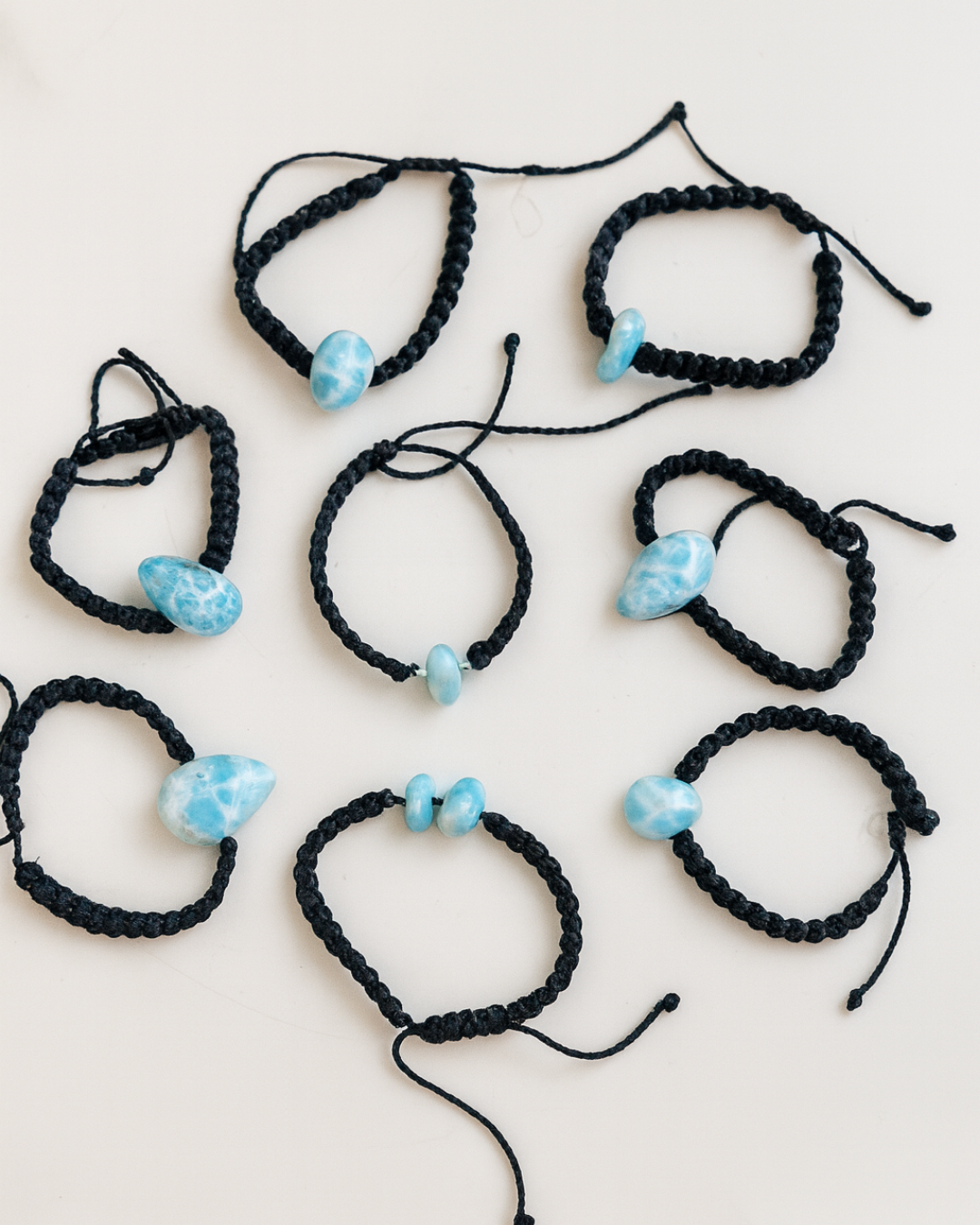 Each bracelet is one-of-a-kind, with natural variations in the shape, color, and pattern of the larimar stone, reflecting the waves of the Caribbean sea. Sizes and stones are chosen at random, ensuring that every bracelet is unique and meant for its wearer.