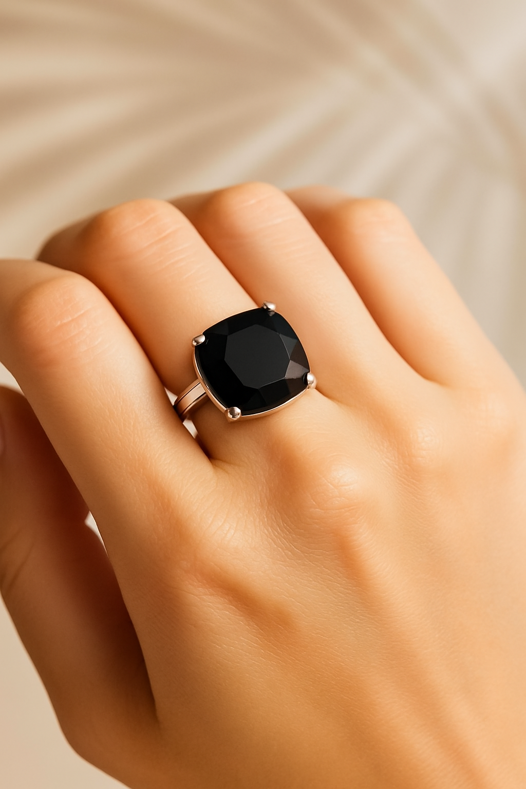 This medium square onyx ring in size 7 features a sleek, faceted onyx gemstone set in a sterling silver band. Known for its powerful protective and grounding properties, onyx is believed to absorb negative energy, enhance inner strength, and promote focus. The bold square shape adds a modern, sophisticated touch, making this ring a striking yet versatile accessory. Perfect for those seeking both spiritual balance and timeless elegance.
