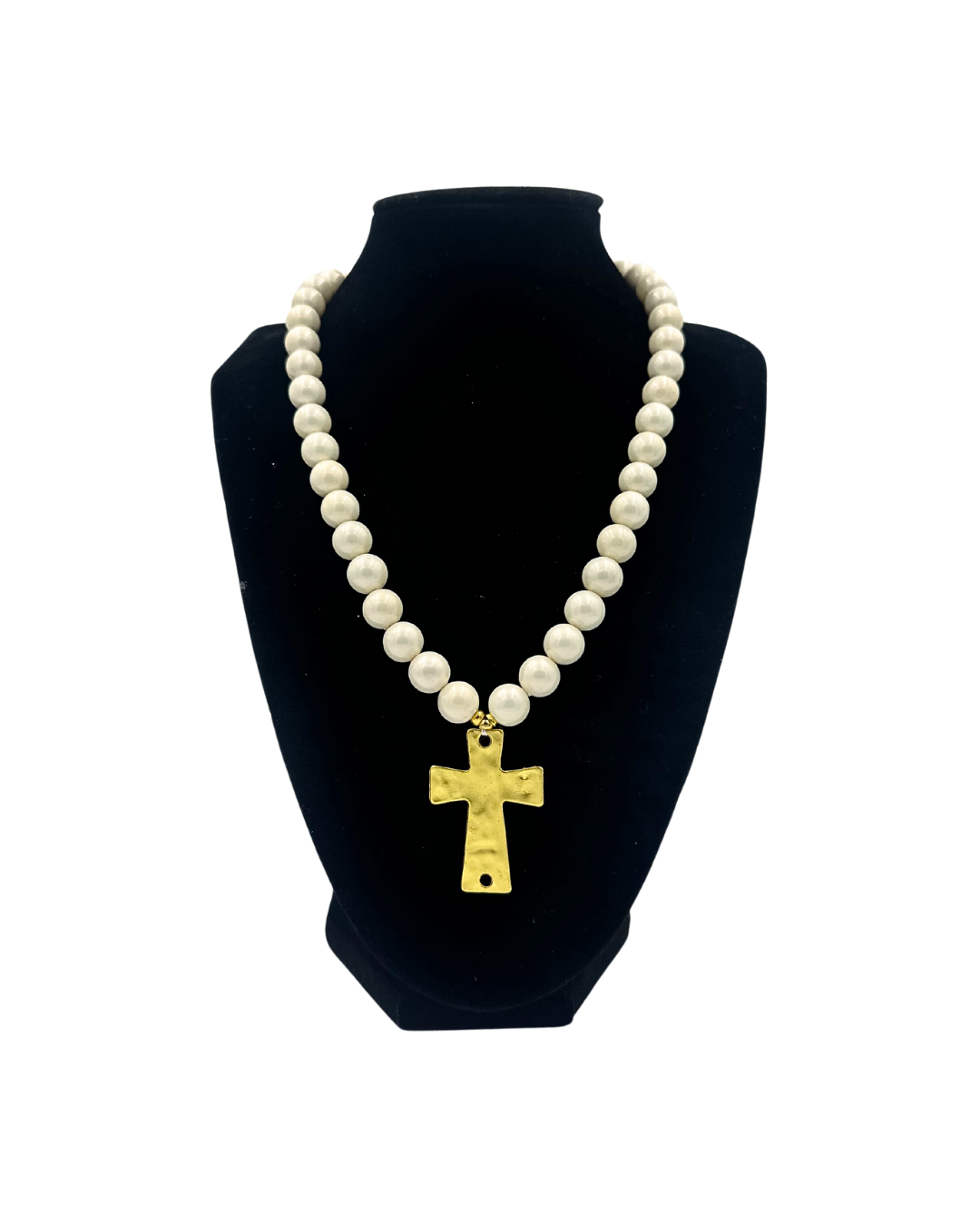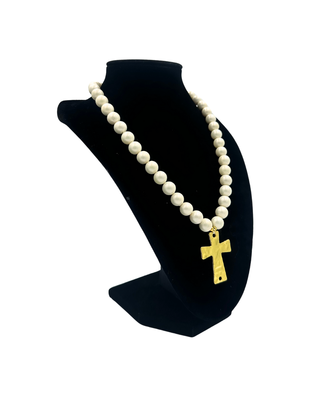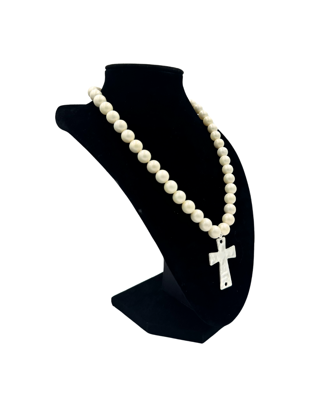 The pearls, with their soft luster and smooth texture, symbolize purity, wisdom, and spiritual enlightenment. Their serene glow complements the strength and protection offered by the copper cross, creating a harmonious blend of grace and spiritual significance. Pearls are often associated with the divine feminine, offering a sense of calm and inner peace.