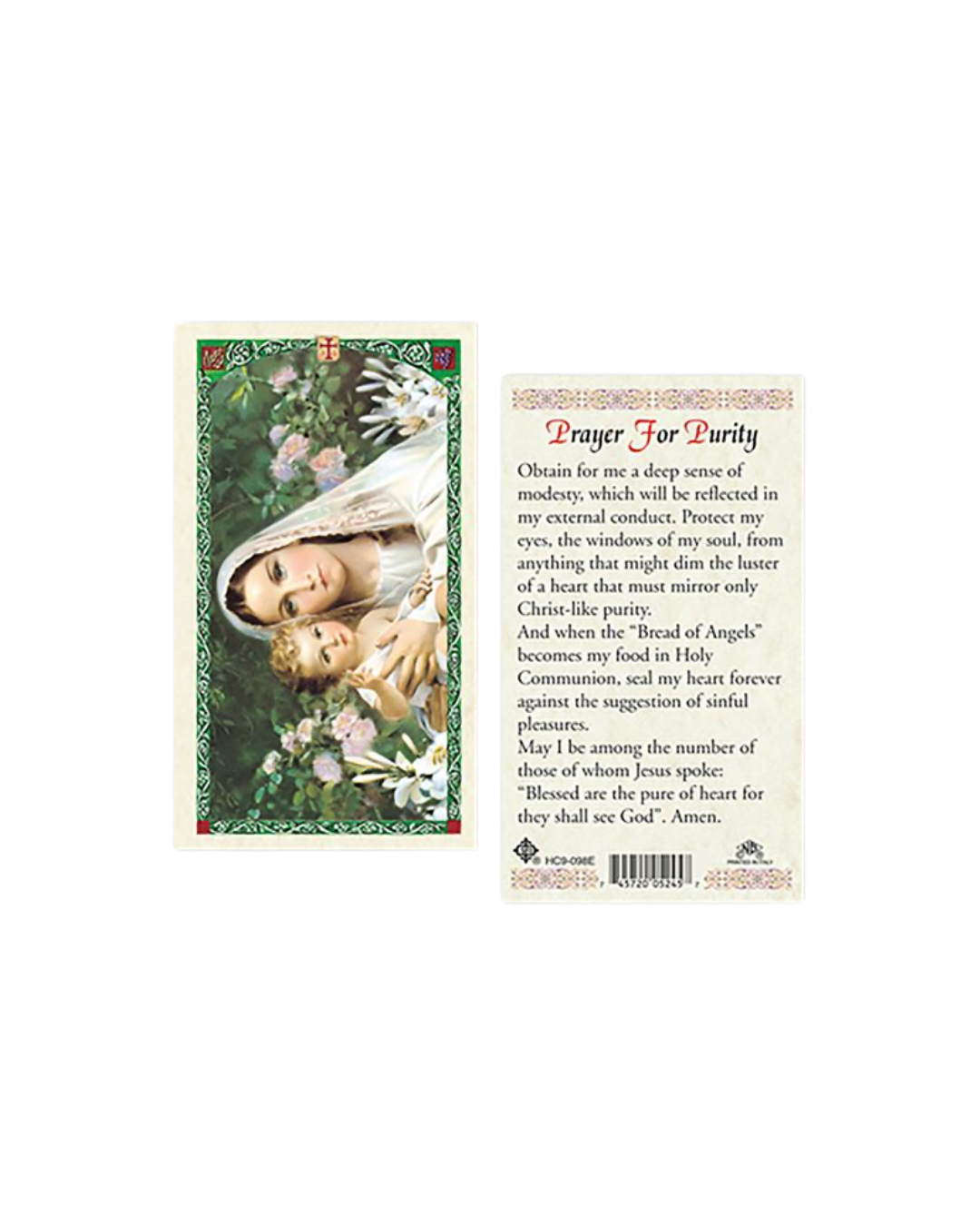 A Purity Prayer Card is a devotional item designed to help individuals seek strength and guidance in maintaining purity in their thoughts, actions, and relationships. It typically features a prayer asking for God's grace to remain pure and virtuous, often accompanied by an image of a saint known for their purity, such as the Virgin Mary. The prayer may ask for divine assistance in resisting temptation and living a life of holiness. The card serves as a reminder of the importance of chastity and purity in the Christian faith and offers comfort to those striving to live according to God's will.