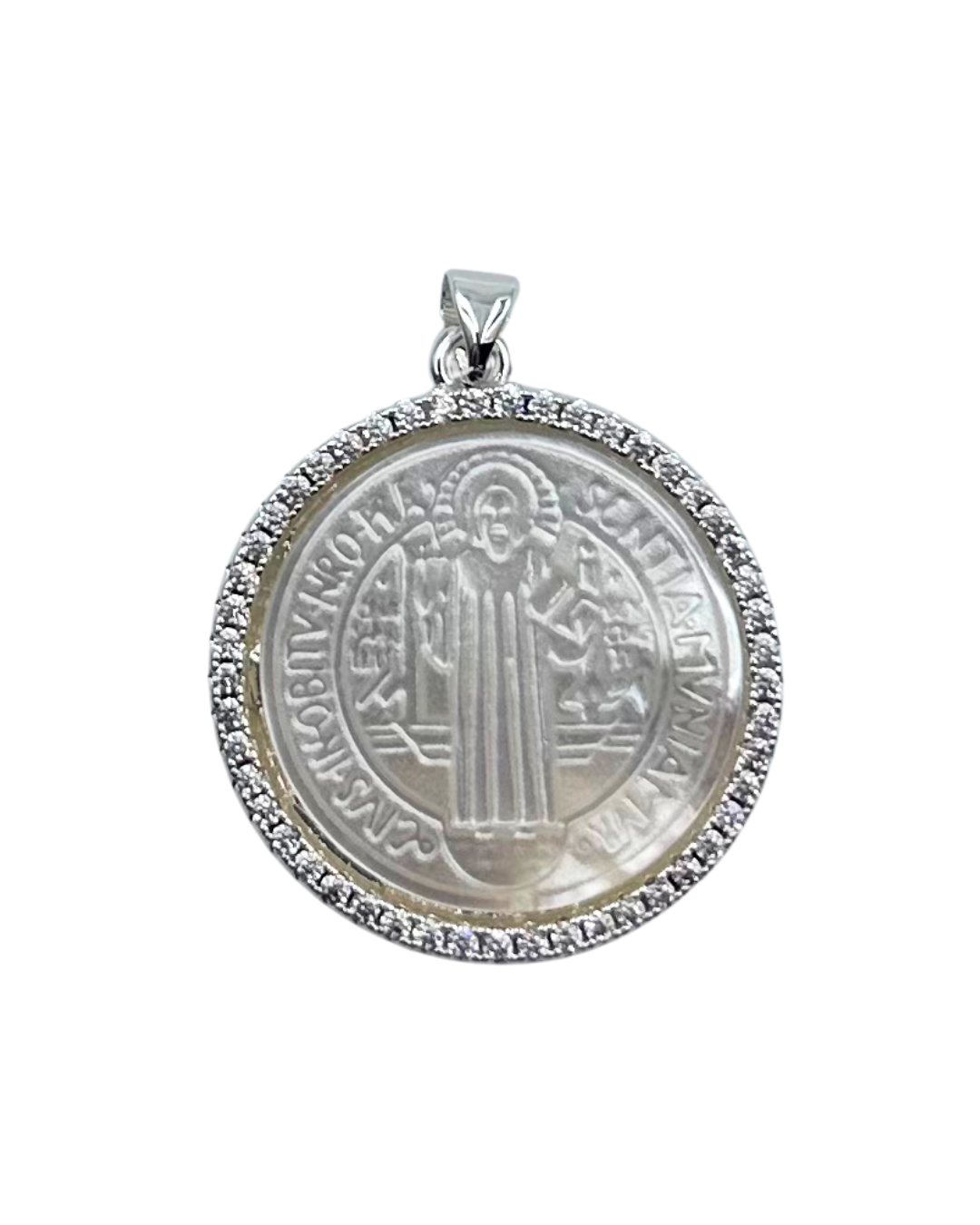 The St. Benedict Medal is one of the most powerful sacramentals in the Catholic tradition, revered for its protection against negativity, temptation, and spiritual harm. This beautifully crafted pendant features a luminous mother of pearl base, elegantly finished in your choice of silver or gold, bearing the image of St. Benedict along with the sacred inscriptions of his cross and prayers of exorcism and blessing.