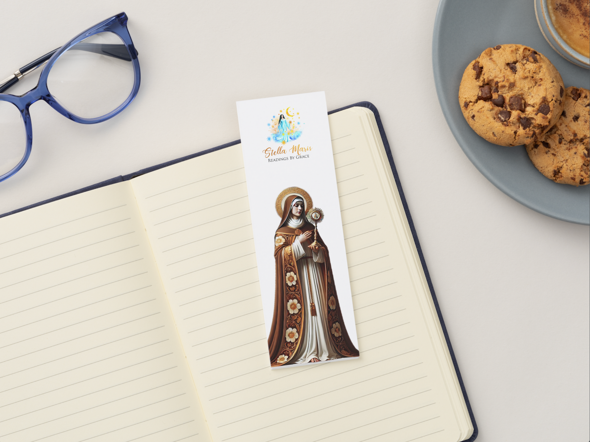 Honor the gentle strength and faith of St. Clare of Assisi with this beautifully crafted bookmark. Known for her deep devotion, humility, and commitment to a life of poverty and prayer, St. Clare is an inspiring figure of spiritual strength. This bookmark features a serene image of St. Clare, often depicted with the monstrance or holding a lamp, symbolizing her devotion to the Eucharist and light in the world. On the back, you’ll find a prayer to St. Clare, asking for her intercession in matters of faith, protection, and guidance. Perfect for Bibles, prayer books, or as a thoughtful gift, this bookmark serves as a reminder of St. Clare's unwavering trust in God's providence and her dedication to a life of simplicity and love.