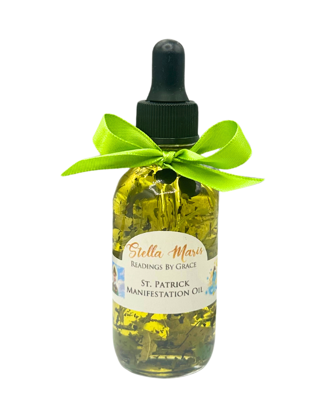 Aproveche la esencia de nuestro aceite de manifestación, cuidadosamente infundido con hierbas y aceites que resuenan con energías espirituales y vibratorias para invocar la poderosa guía, protección y buena fortuna asociada con San Patricio. Abrace la transformación y la positividad, ya que este aceite repele las energías oscuras y negativas, despejando el camino para que sus sueños se manifiesten y eleven su yo más verdadero.